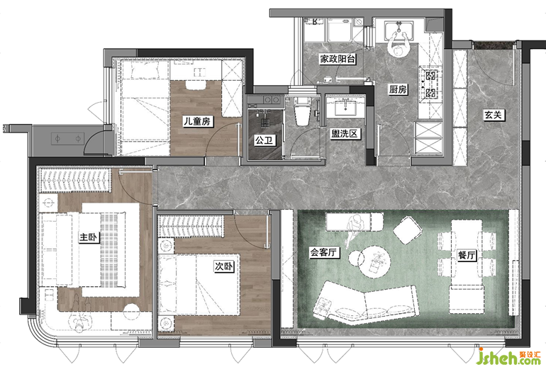 化用重庆生态资源中的竹海元素,墨绿的沙发垫、深绿的椅子,挂画呈现丘陵里竹海的随风起伏,重庆样板间设计由淡淡竹海演绎的地毯,由山间清泉化来的抱枕,将点点优雅凝聚于室内中。