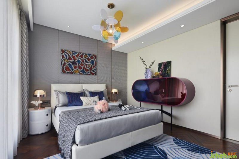 紫、蓝、红三色亚克力烤漆拼接成的收纳柜,与严谨的空间配比全然融于一体,共同诠释热忱随心的精神内涵。
