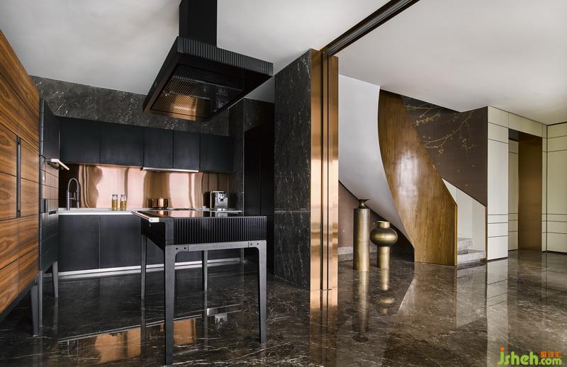 一组暗藏玻璃移门划分出厨房区域,对黑色的挑选极为纯粹,让艺术质感流淌,品位格调升级。沉调与亮调贯穿两个界面的自由探寻。
