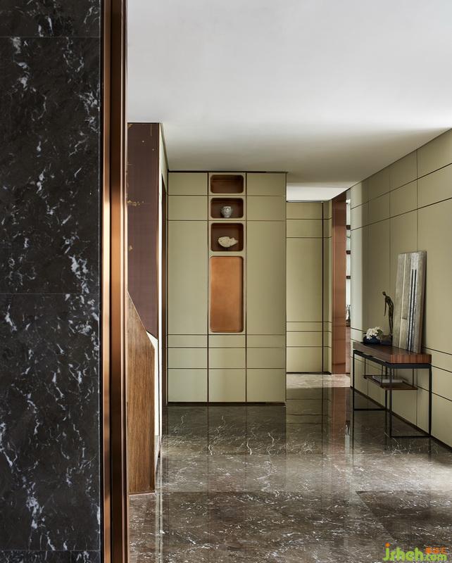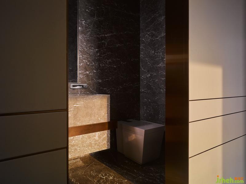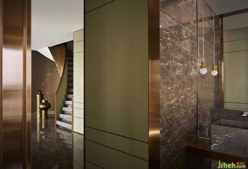主要材料| 拿铁灰石材、珍妮灰石材、古铜、黑胡桃木、珍珠鱼皮、壁布