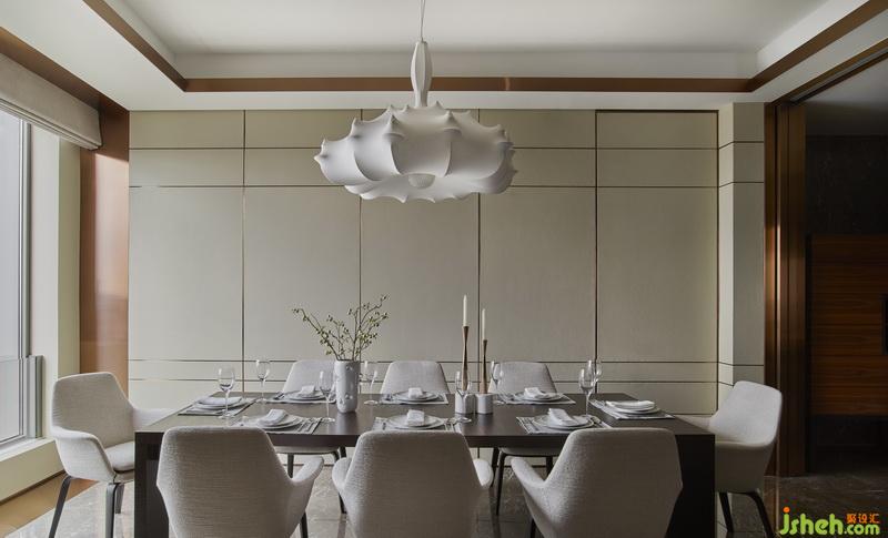 餐厅以高级灰皮革饰面铺呈,金属包边精确分割布局,静美的白色艺术吊灯柔和空间硬朗线条,花枝与烛台装点成趣,干净疏朗的氛围里弥漫着一丝浪漫情调。