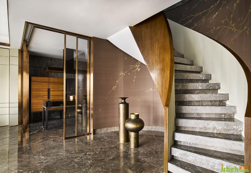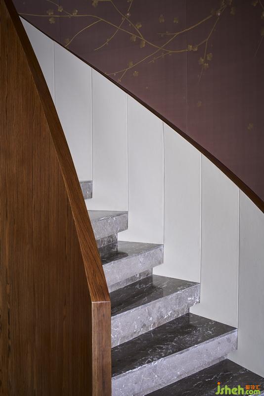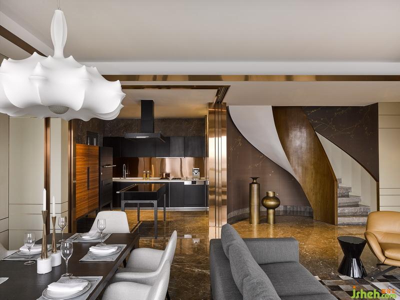 弧形楼梯蜿蜒而至,古铜摆件与立面手工壁纸自成一景。台阶拾级而上,将室内与顶端露台相连接,深色木材与皮革混搭,彰显出对缝手法的魅力,让情绪在不经意间释放。