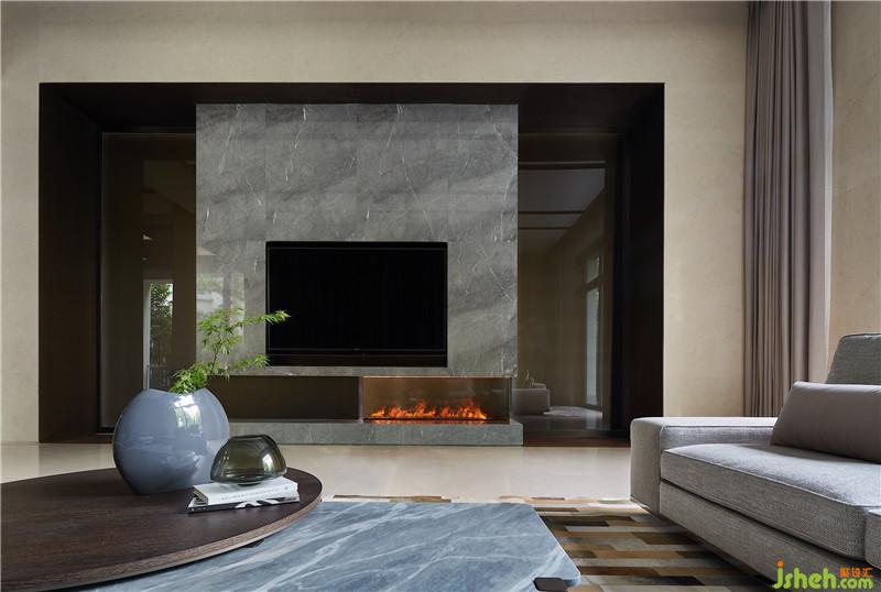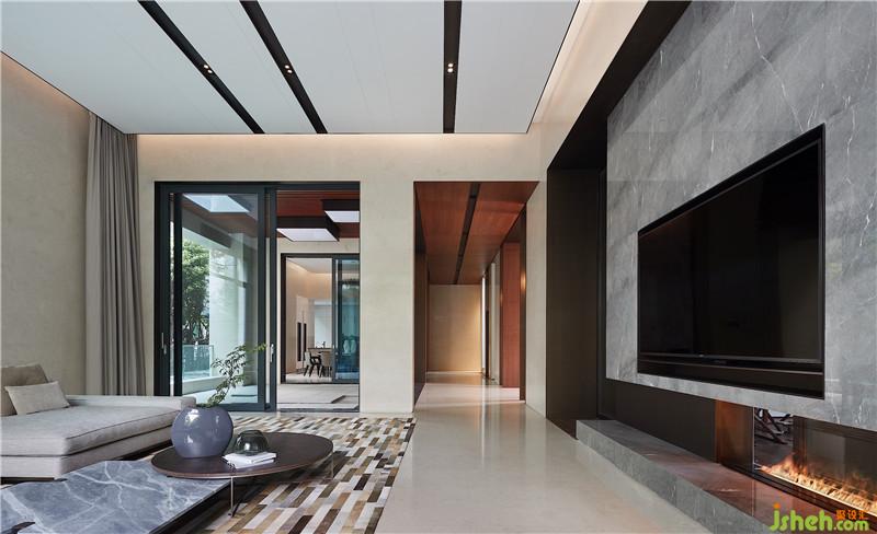 电视背景墙悬挂而立,隔而不断别具美感。客厅以“尺度”彰显大宅风范,更以此来衬托主人气度。而茶室、棋牌室与客厅相隔而设,两侧玻璃移门开阖之间呈现不同场景氛围。室内设计师