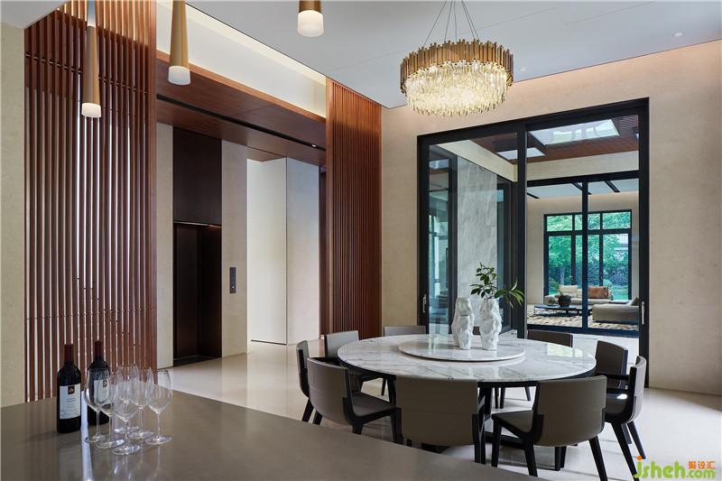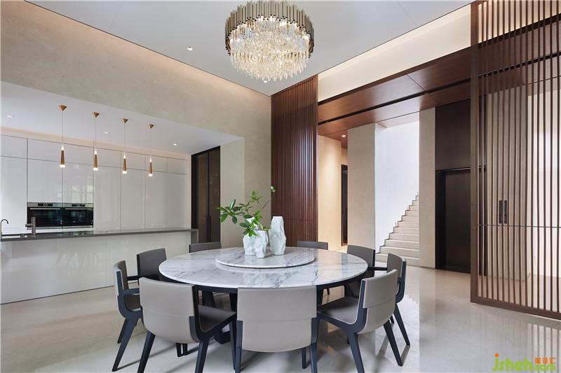 餐厨区域中圆形餐桌与方正岛台、块面相对,既柔和棱角,又塑造张力。两侧设置可移动木格栅,影影绰绰间,增添一抹纤巧灵动的意境。