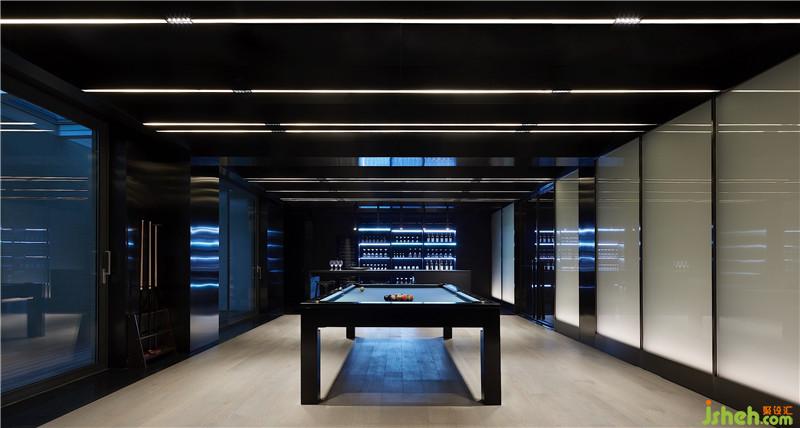 地下一层为休闲娱乐空间,品酒区、台球室、影音室、乒乓球室一应俱全,满足业主多元化的功能需求。台球室与品酒区一体而成,经由俊朗的材质强调线条垂直感以及映射延展性,塑造出丰富的立体构成。