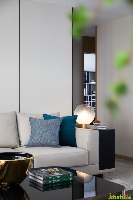 客厅使用纵轴设计,以L型沙发及组合茶几,搭配两侧单椅的围合手法,拉伸整个客厅的体量感,强化入户的第一感官,令其更显开阔。个性化定制的沙发,侧边引入功能性柜体,以细节成就家居体验。