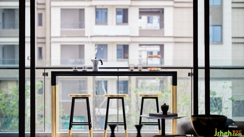 观景阳台是客厅向室外的延伸,以实木和金箔打造吧台区,精致与休闲感并存,于此尽揽户外风光,颇有“闹中取静”、“忙里偷闲”之态。