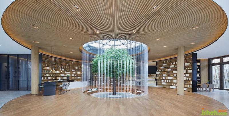 设计师因势挖掘建筑特点,将树屋安置为核心所在,融合“圆”的概念向外扩散,以充满雕塑感以及流动性的手法,来构造动线丰富的序列组合。在层层相迭的围合形态中,各功能分区都可与树屋交流对话,同时将亲子陪伴巧妙融入,赋予空间丰富层次与生机活力。