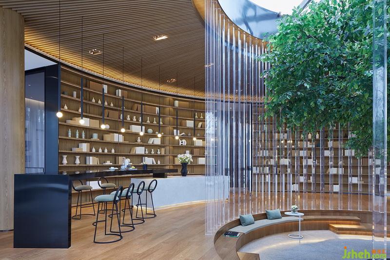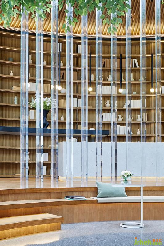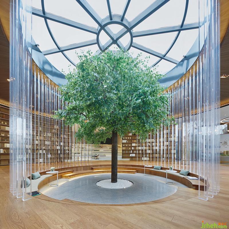 树屋顶面木格栅呈放射状向四周铺陈,地面、立面均借由木质与之遥相呼应。阳光透过顶端采光井洒入,内外共生,经由透明亚克力散射,配合多维的灯带作用,构筑极具韵律之感、且又伴有变化的光影效果。