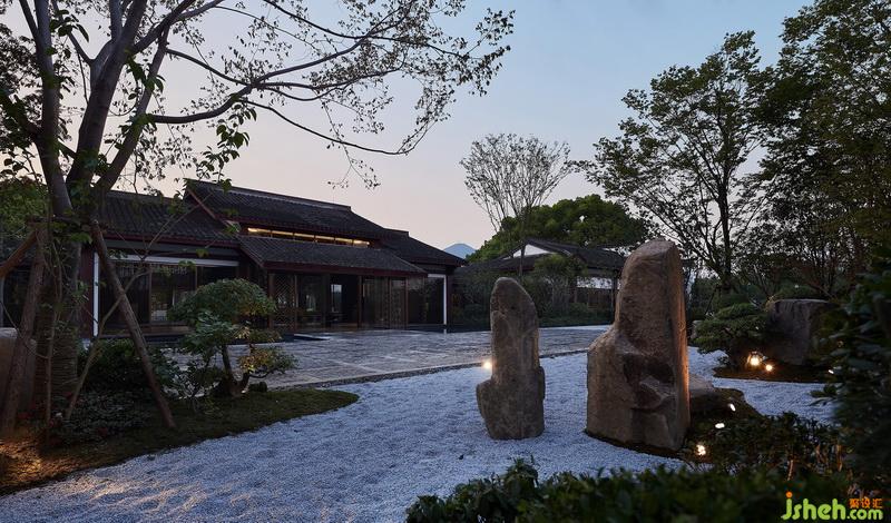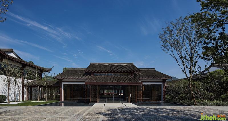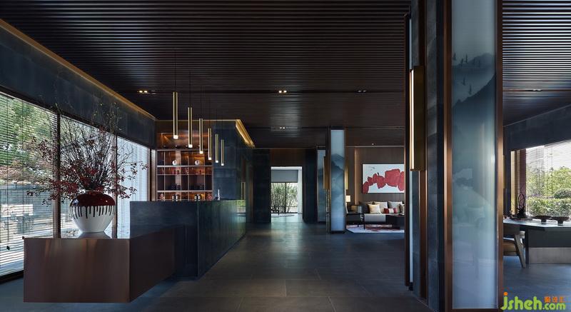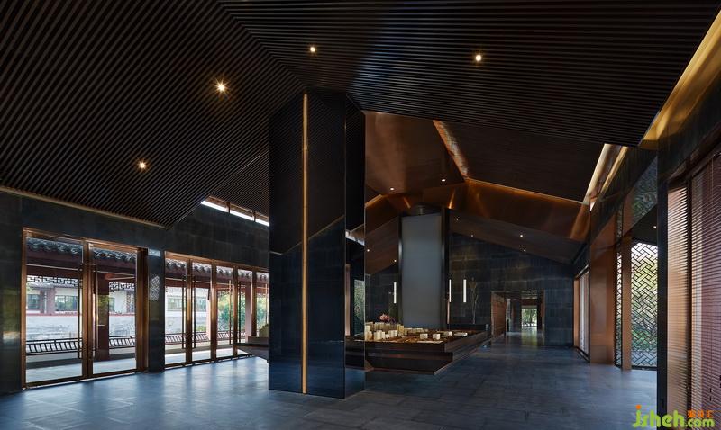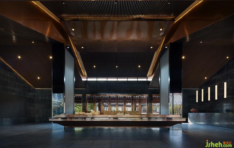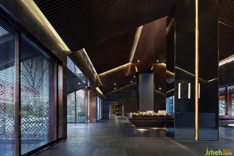 大堂内注重材质的克制与平衡,大面的黑色基底将仪式感与雄浑气势渲染而出。金属镂空格栅显江南韵律,斜屋顶及顶端挑空区窗口,则是对传统物态的解构与再造。剥开视觉表象,映射出来的是现代、东方、艺术、自然等内核元素,给宾客无与伦比的感官体验。