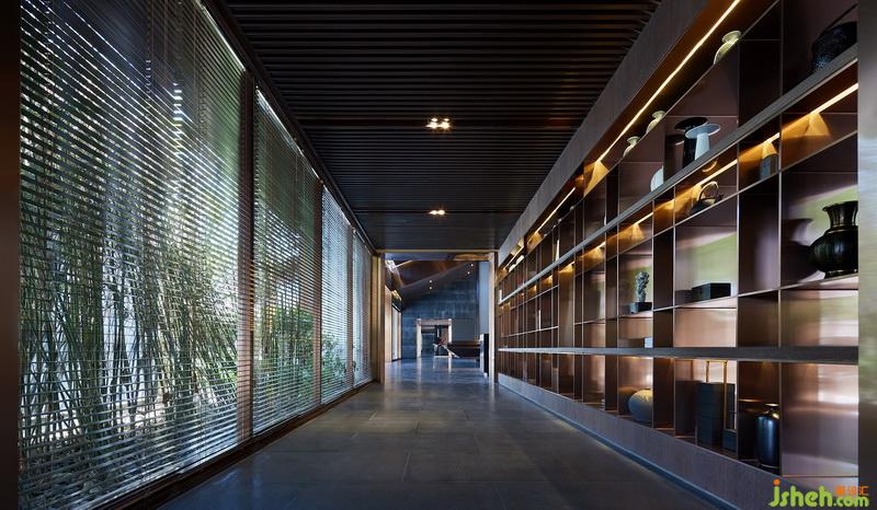 大堂东侧,因势利用通道设置艺术长廊,充沛的线条韵律,灵动的格架镂空分割,虚实相生互补,气场也在随之巧妙切换。