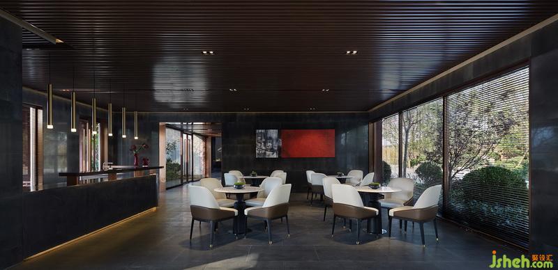 大堂西侧,全景落地玻璃及百叶搭配,加以园林框景手法,呈现意境之美、隐隐约约之效。穿回廊而过,便见洽谈区,顿时豁然开朗。