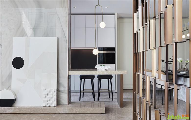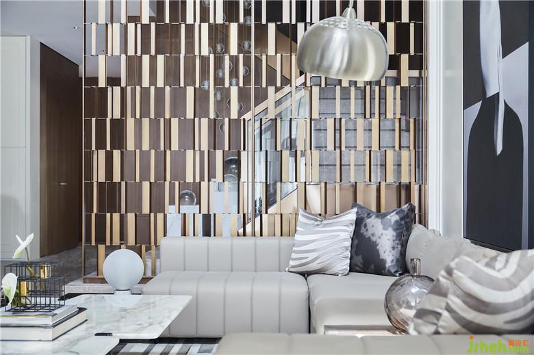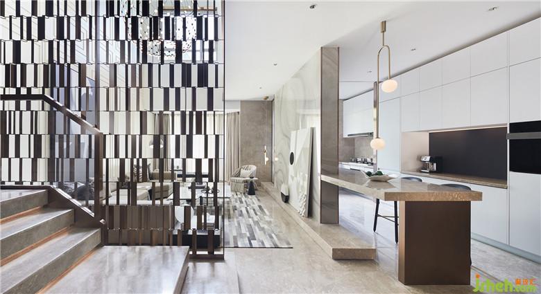 挑高6.5米的客厅,沙发后方背景线板一贯而上,透过对面的夹丝玻璃与厨房以及二楼客卧套间相望,另一侧借助半遮挡半通透的金属屏风与楼梯对话。此外,客厅亦与吧台、餐厅开敞联合,有效拓展了公共区域的活动范围与分区层次。