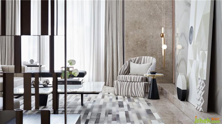 设计元素的呼应与融合在此运用娴熟:客厅两端立面的画作,均由黑白灰三色演绎,以简约的笔触勾勒艺术感知;背景线板与沙发都极具体块与线条韵律,后方非常规尺寸的画作将人的视线自然引向上方,衔接之余又散发出一种不可言说的魅力;条块状金属屏风衍生的错位分割感,也在两幅画作、茶几、牛皮拼接地毯上得到体现。