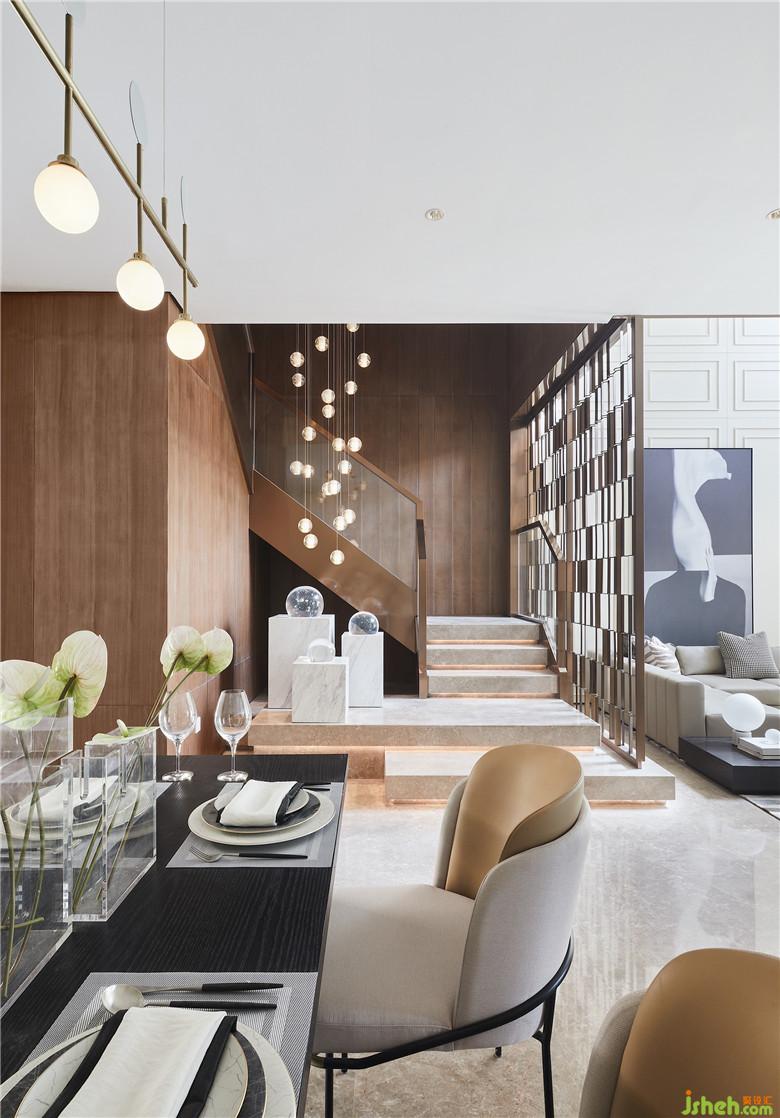 不同的材质、造型、色泽于餐厅交织,错落有致,立面沿用大块面线板充当最适宜的调色板,渲染出典雅且轻松的用餐环境。