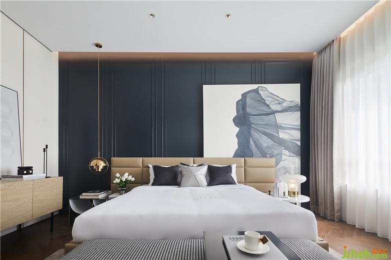 三楼主卧套间,靛蓝的背景线板,与大地色系和谐交融,烘托出自然沉稳而不失高贵的气场,又蕴藏诸多质感层次的碰撞与转换。