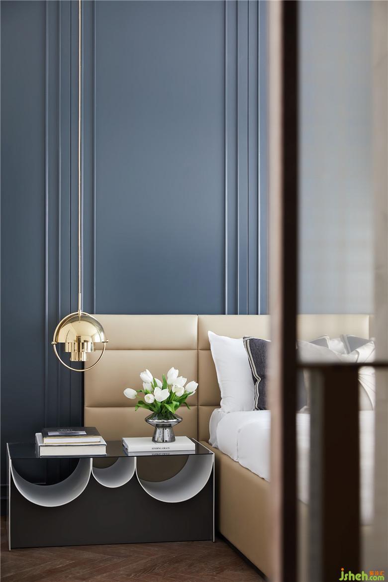 两侧床头柜,呈现方中有圆、圆中有方的组合形态,配合轻盈、神秘气质的画作,让一抹优雅回荡其间。