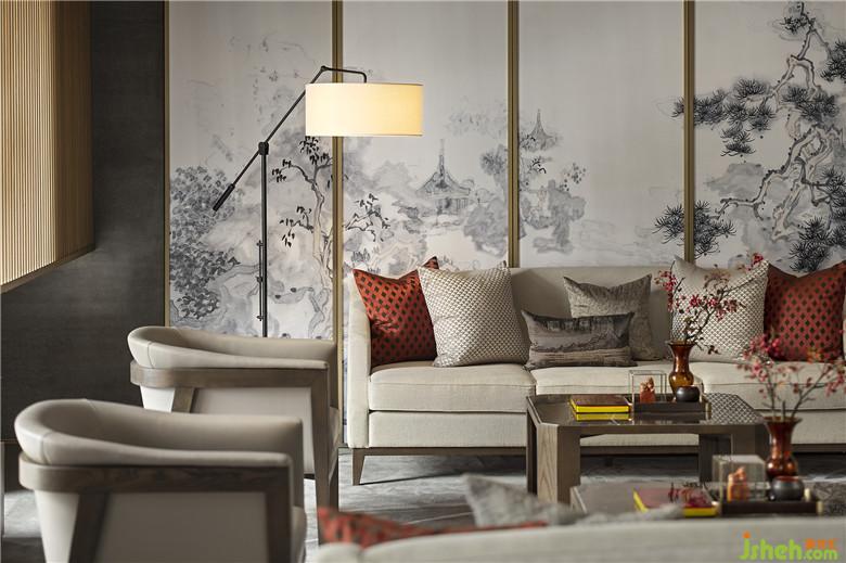 浅度洽谈区,左右对称,尊崇礼制,门洞与展示格架大小相同且彼此对应,顶部同样为印章轮廓组合而成,让水吧台背景退到最末端,谱写一场深与浅、光与暗、近和远的和谐奏鸣曲。在陈设上则精心撷取了具有通透质感的琉璃,古典的造型,质朴的色泽,都恰到好处。
