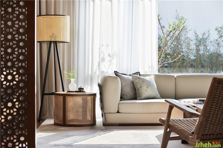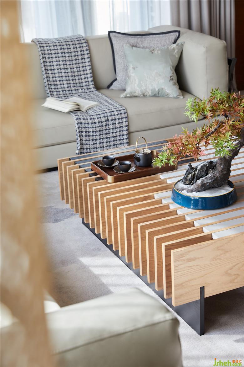 以木色与暖灰铺陈,代替原本深色系家具、地毯等,并一改原先零散的摆放,搭配牛皮绳手工编织椅,进行半围合式布局,客厅更显亲和与完整。