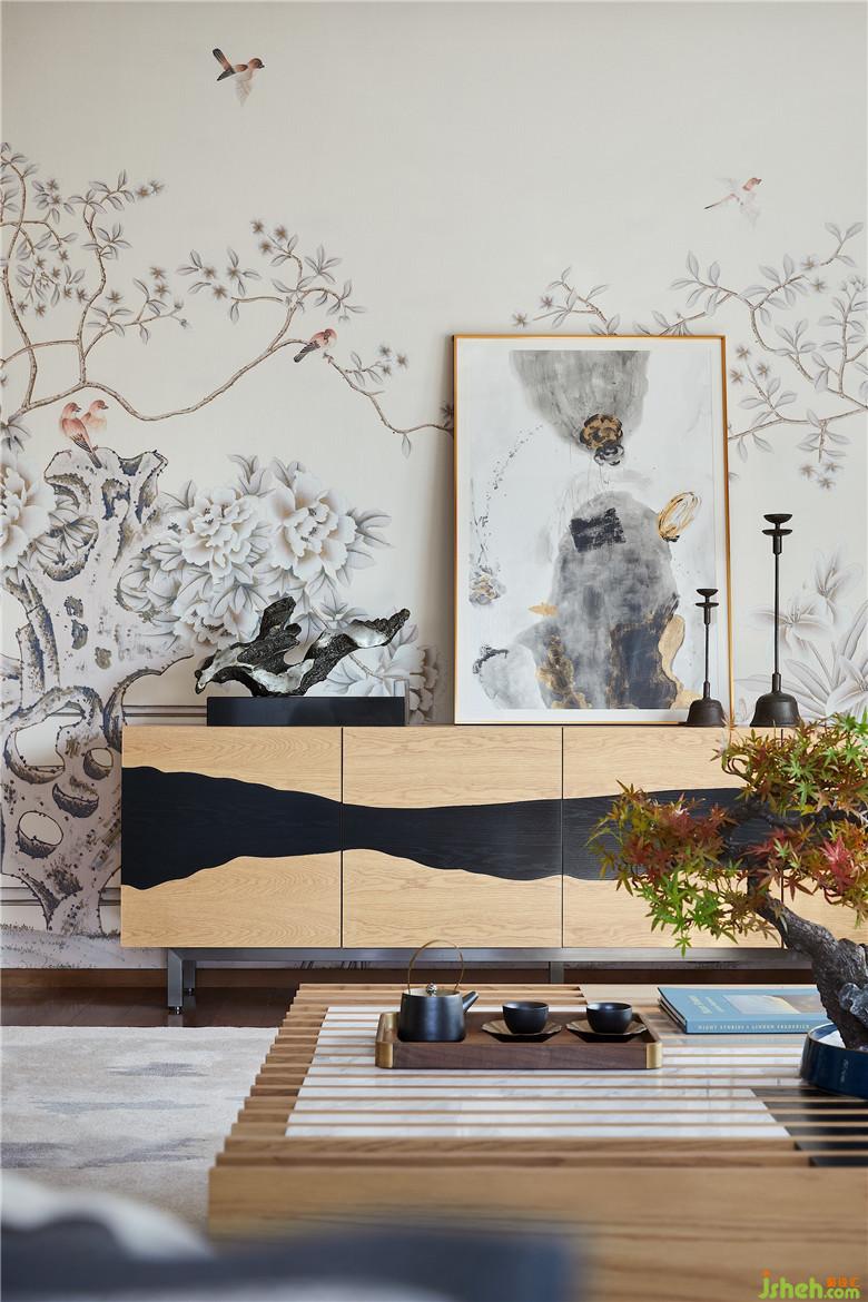 该别墅与太湖相邻,于是设计师汲取历史悠久的中华赏石文化,以太湖石元素的壁纸妆点客厅。拆除一楼原有的金属格窗,凭两面落地窗引户外美景、光线入室。