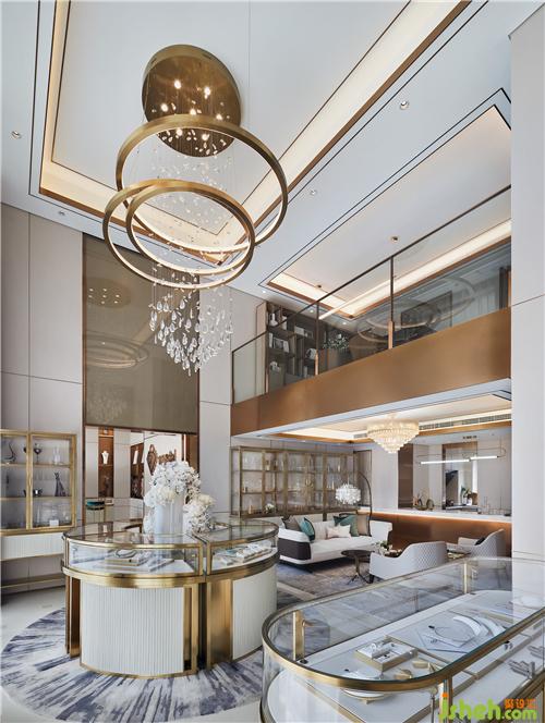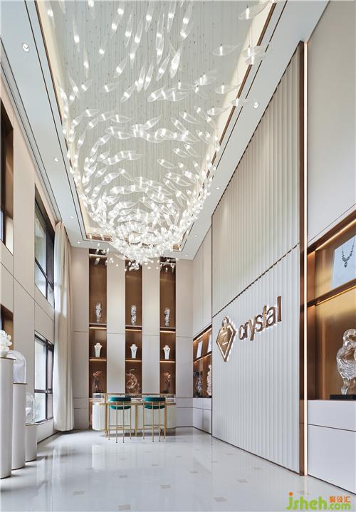 规划的商业架构以水晶为主角,设计团队仔细梳理了功能分区与动线关系,旨在呈现宛如奢侈品店的情景氛围。同时又遵循商业设计所要表达的商业逻辑,搭建多元、全方位的展陈形式,并有效利用夹层设置互通、错层的视觉,预设洽谈区与水吧台,进一步提升商业服务质量,强化访客体验。