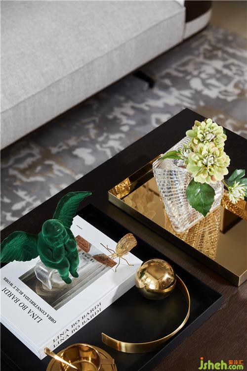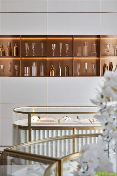 壁布一路向右侧延伸,垭口上方覆以夹丝玻璃所构筑成的立面,与墙体良好互衬,一种别样的高级灰质感扑面而来。同时采用各式橱窗、展示柜,搭配水晶衍生品进行陈列,材料、肌理与色泽于此交织对照,达成丰富意义的消费体验,为空间赋予更多的商业价值。