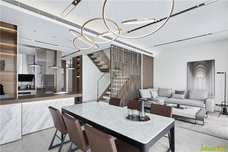 厨房、吧台、餐厅自由的形式,让尺寸感、舒适度以及便利性进一步提升,烤漆板与金属贯穿始终,加由视觉和触觉上的多元碰撞、对比,映衬一种微妙的开放与互动。