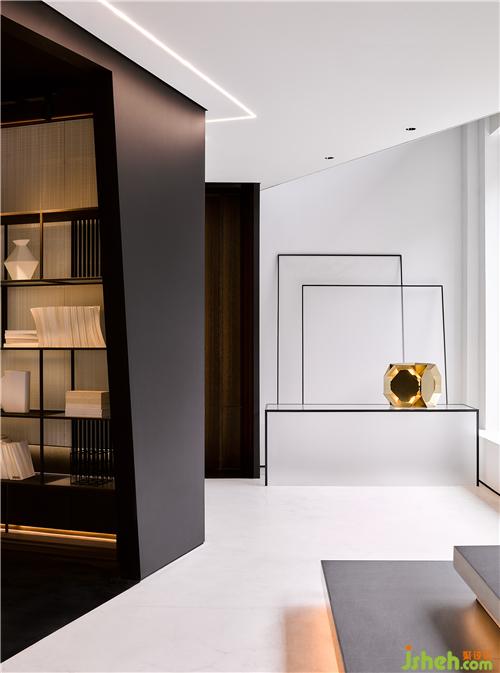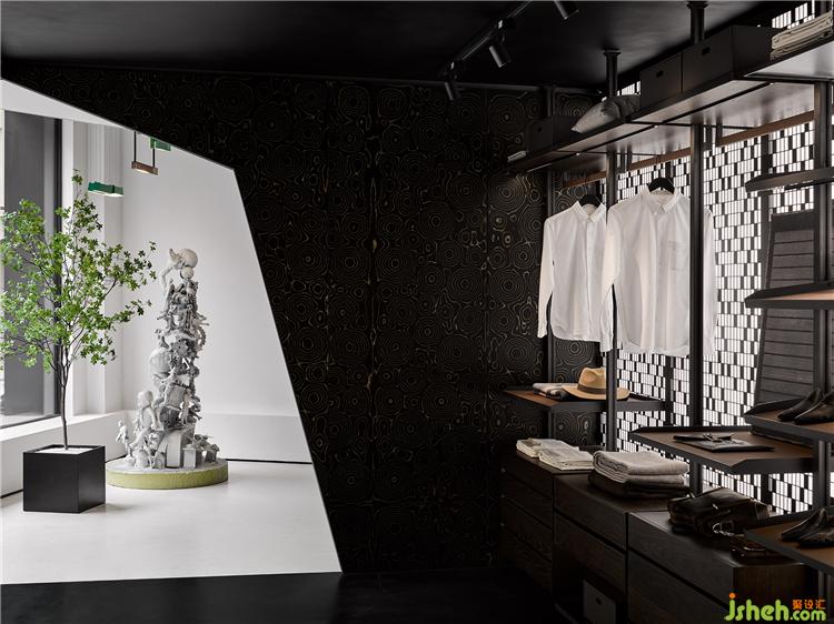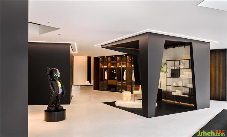 设计师将建筑手法迁移至室内,以大块黑白布色,硬朗的线条穿插其中,简洁的白底与黑色体块串联,不设置庞杂的隔断。干净利落的半私密式布局,既保持了亲密,也留有神秘,装修在递进与交互之间演绎出层次之美。限量解剖版的KAWS玩偶在正中央处热情迎接每一位访客的到来。