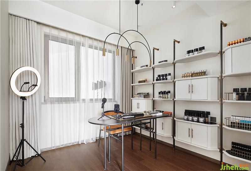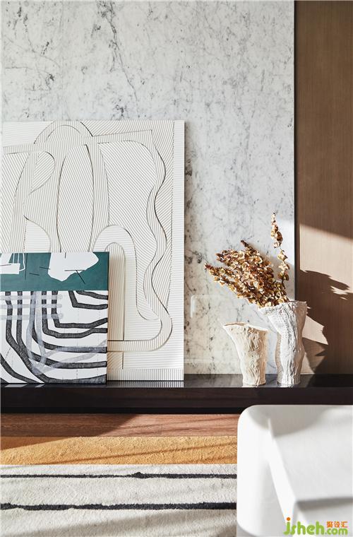 背景墙由木饰面到石材的转变,也意味着场所的步步深入。同时将金属板嵌入,极具特色的置物格架亦由此而生。多种材料的冷暖调和,在色彩与几何元素的融合碰撞中,构筑优雅格调。