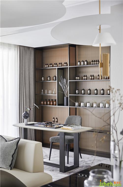 书写区则退居后方,以开放式打破单一调性,格架造型大气简约,在规整的秩序之下,又让低奢与感性于不经意间传达至每一处。