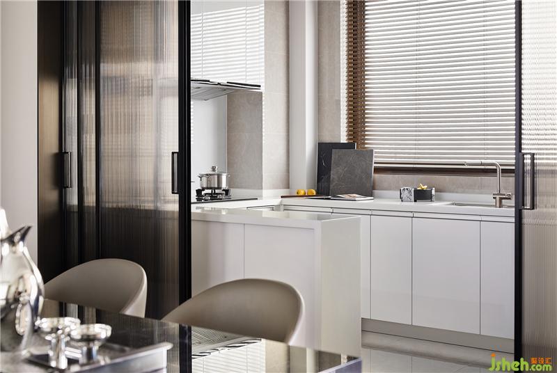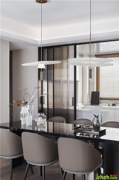 精巧的选材、用色在餐厨区也得以延续,又在轻重、明暗、深浅有别中,形成反差对比。此外,样板房设计塑造美观的同时还注重强调日常细节,并以玻璃移门的开合之道勾勒出满满的品质感与仪式感。
