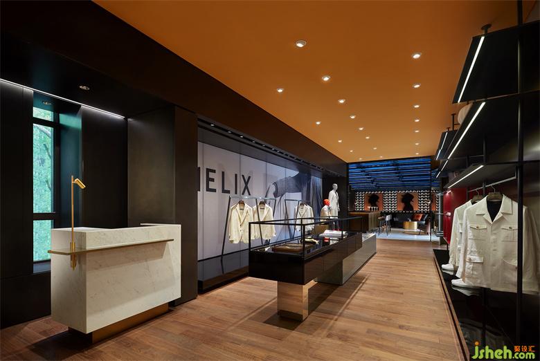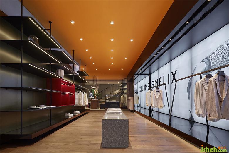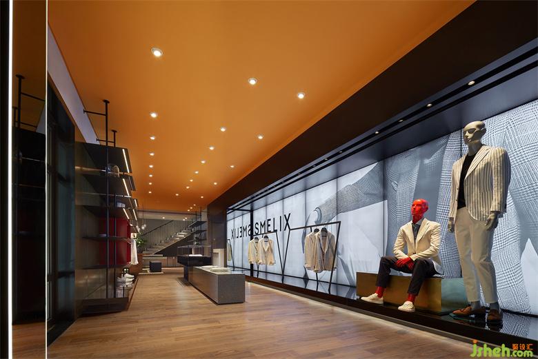 男装店铺设计以内凹的BOX体块,结合大面灯箱的使用,构造出室内橱窗之感。根据前端的产品陈列样式,亦可对灯箱实行全色域控制,使二者协调契合,另一方面也预留更多的可塑性。