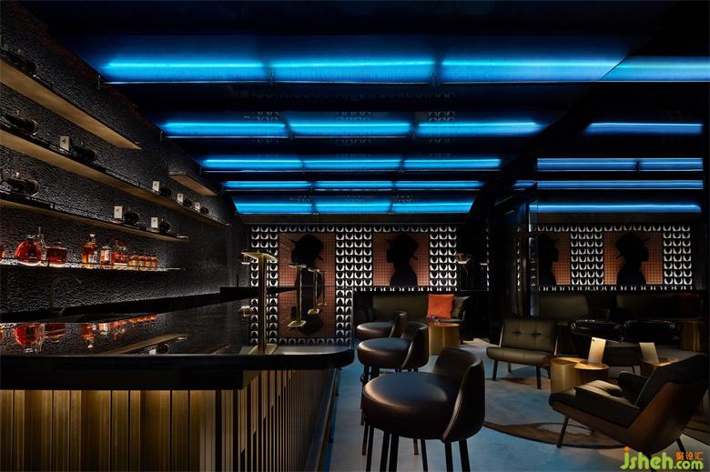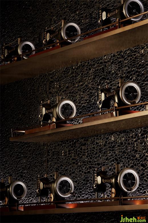 作为藏身于Smelix里面的酒吧,高定男装的特色元素也得以延续与强化。大块黑布铺陈打底,由量体裁衣的皮尺刻度演变而来的坐标格网,以绅士剪影叠映其上,白色衬衫衣领围绕四周,以及另一侧墙面上缝纫机的加持,皆从多维度唤醒主题印记。