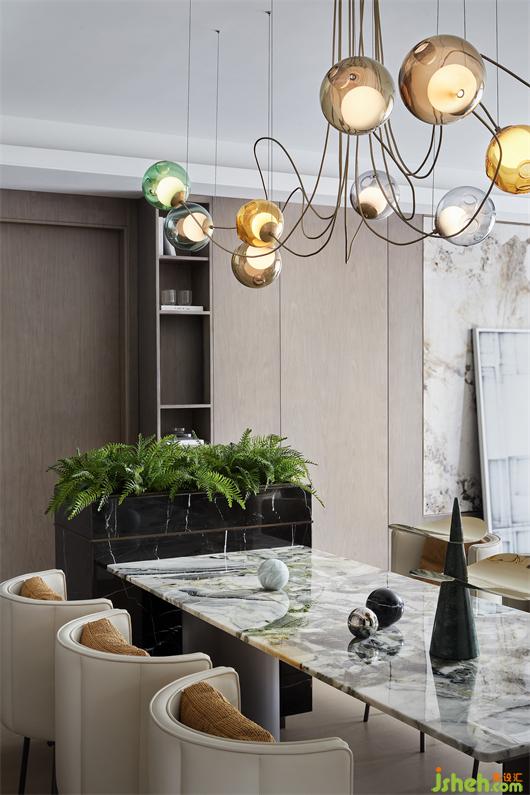 以开放松弛的面貌邂逅归家之旅,入户的第一视觉,便能直观感受到绿意气息。放眼向上,绚丽多姿的吊灯恰如装置艺术一般,以奔放律动的身姿开启热情的迎接。
