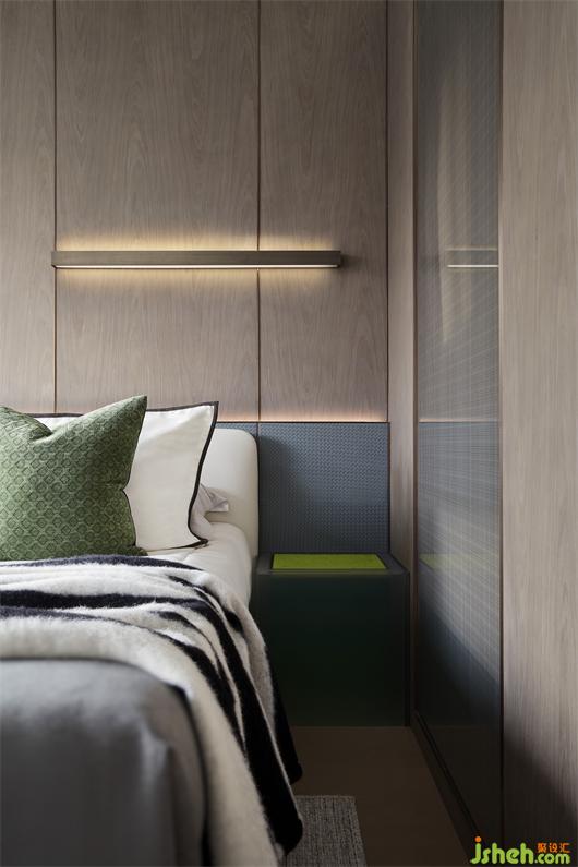 次卧同样遵循利落简洁的手法,块面的叠层之感从床品蔓延至床头背板,在变化与衔接中形成碰撞,勾勒出多维的层次。看似随性,实则有内在的逻辑关联。
