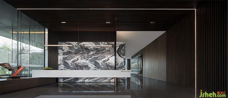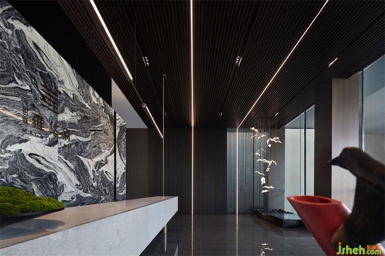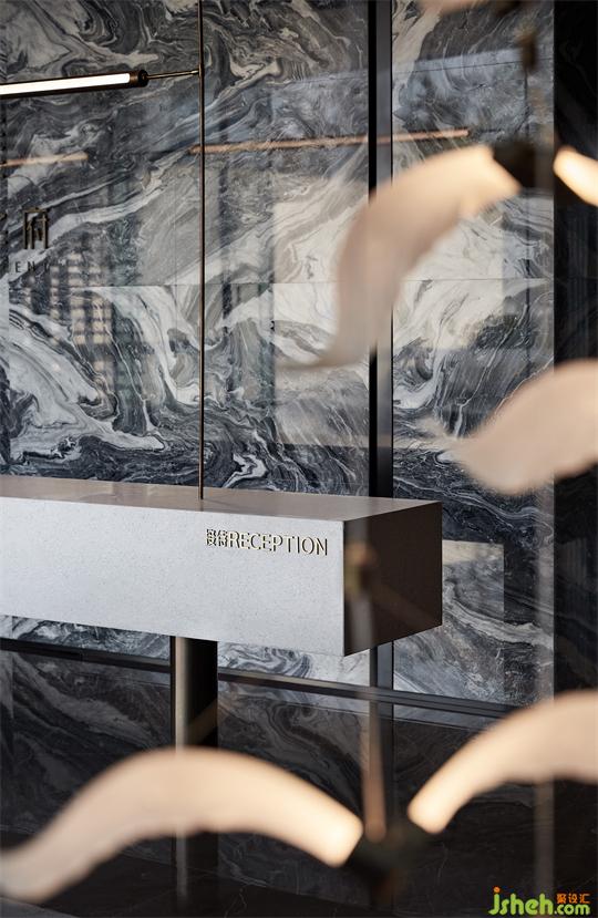 接待前厅个性纹理的石材引人注目,灯带点缀于格栅之中,售楼处设计并从墙面一折而上延伸至顶面,此外体块穿插、构成关系于此自由表达,多种材质、肌理的碰撞配比,让层次更加鲜明。既打破了沉闷、单调,又在一开场便勾勒出大气的东方韵味。