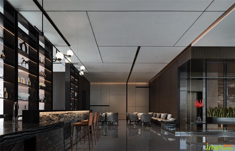 水吧区域以均衡性作为出发点,拿捏统筹点、线、面、体使其交织互补,加上对光的熟稔把控,售楼处设计以丰富的质感、纹理,共述功用与美学。
