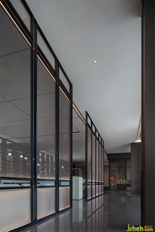 金属网同样延伸至电梯处,朦胧的光线和绿植与户外遥相呼应,也以润物细无声的方式自成一道风景。