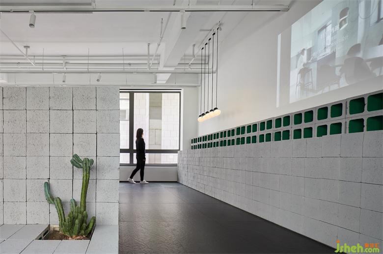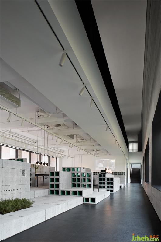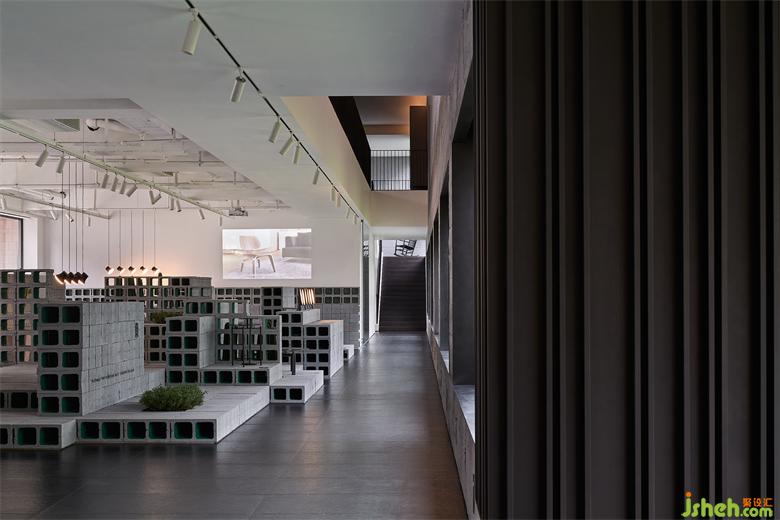 办公室设计师最终通过策展思维,让这里幻化成一座大舞台。展示区选用了颇为常用的工程材料——空心砖,并以此堆垒出微缩版的楼宇形态,错落林立,却又浑然一体。产品也立于各自契合的位置,演绎出“远近高低各不同”的风景,统一之中又蕴藏变化性。即便后期展览主题更新,也同样可以机动转化。