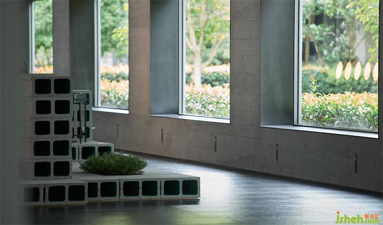 空心砖内壁涂以绿色装饰,蓬勃生机的植物同样散布于此,既不会过于跳脱,又有一定的互融性。展示区采用回型动线,每一个展示面都设有开口路径,可踏入内部。穿梭其间,借助动态的影像、静态的展陈、叙述的文字,进一步丰富人与场所、产品的关联,也传递情感与价值认知。