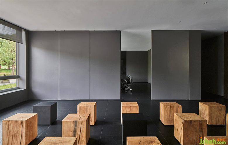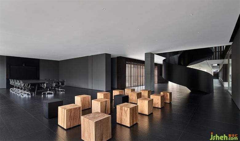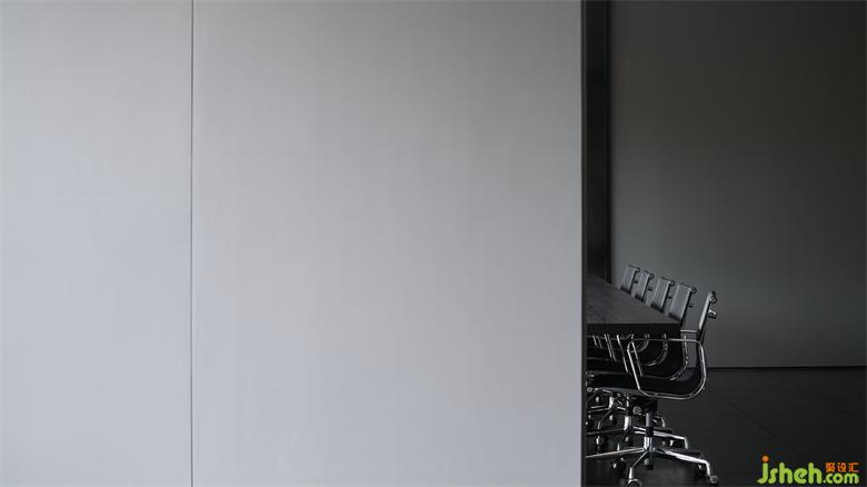 L型另一侧以深色为基调,旨在将外部的自然风光更从容的引入进来。移门划分沙龙区与会议室,彼此既可相对独立,又能联合一体,其可变性也为满足后续不同规模的情景使用创造了条件。