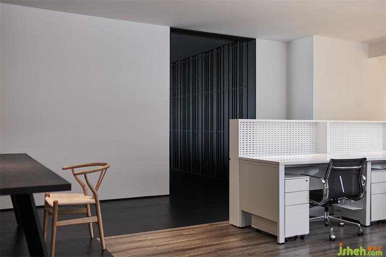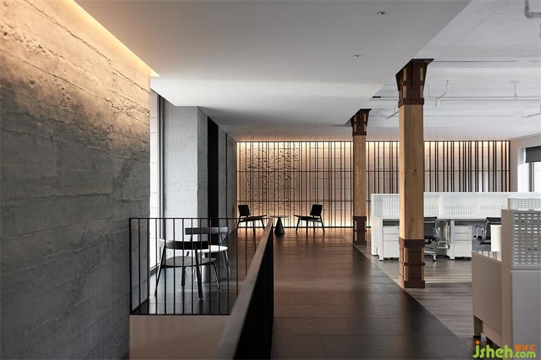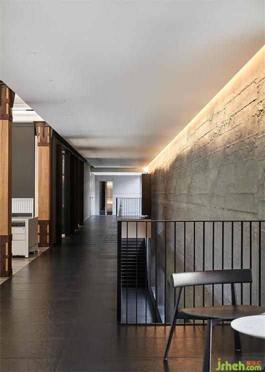 顺着圆弧楼梯抵达二层,两侧墙体以错位框景打破单调。连接两大开放办公区的通道随即映入眼帘,从实用性考虑,将原本的面宽适度缩减,并设置整面的暗藏柜体,删繁就简,旨在带来更优功用。
