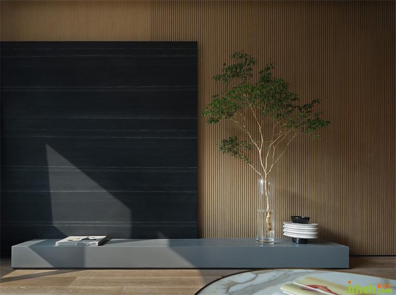样板间设计墙面在黄金分割点处以石成画,另一侧烤漆板分割肌理的手法,互为对景,各显其韵,焕发出精妙的层次。