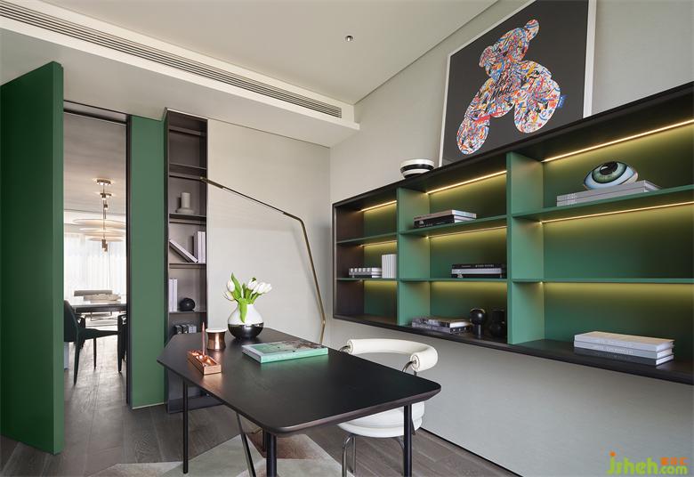 精神疆域的丰盈也是样板间设计追求之一,书房内规整的半吊柜空悬,不规则书桌与地毯的契合使用,加以个性藏品的点缀,凝练着思维广度与高雅气质,在此办公与收藏两者皆可全。