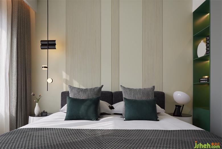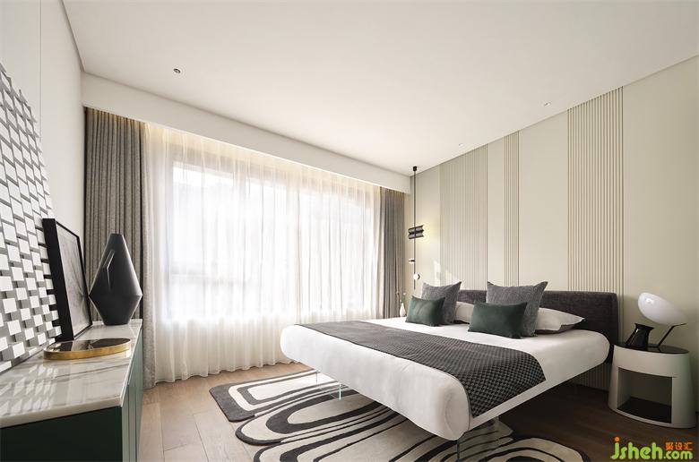主卧床背景以质朴有序的线条加上适当的留白,极富韵律,给人松弛平静之感。样板间设计半悬浮的床体工艺颇为考究,打破常规认知,在承重与轻盈的最大化平衡中,带来无限畅想与别样情趣。