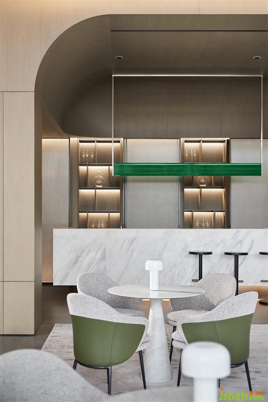 盎然生机与都市人文相遇,精雕细琢的水吧区随即而出。延续了一贯的设计手法,干练的线条与规整的廓形构成微妙平衡。玻璃移门的开合变化,也赋予多元的表情。