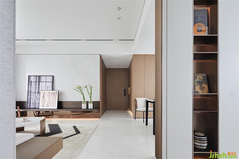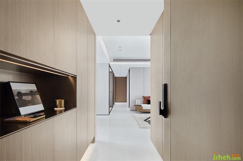 南京样板间设计背景墙一面以线型分割来增添韵律,另一面则巧妙处理不同材质的交辉叠加,映衬出悬浮轻盈感,彼此相望,大块面之中又不乏细微的变化,不俗品味悄然释放。