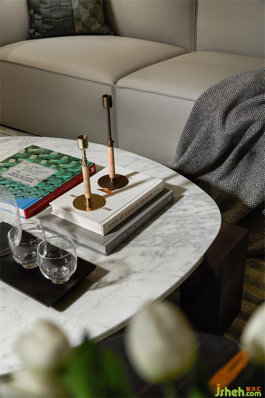 尺度阔绰从容,动线优雅流畅,惬意之感自客厅扑面而来。电视背景墙以木饰面和皮革做拼接,层次感十足,软装陈设亦强调功用,南京样板间设计拒绝过多装饰,加以色彩、肌理的呼应,干练利落,也呈现出理性的轻奢调性和高雅的审美体验。