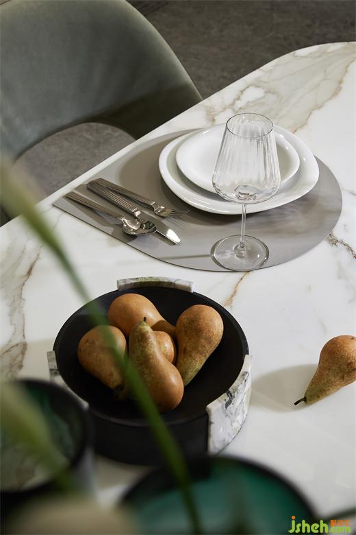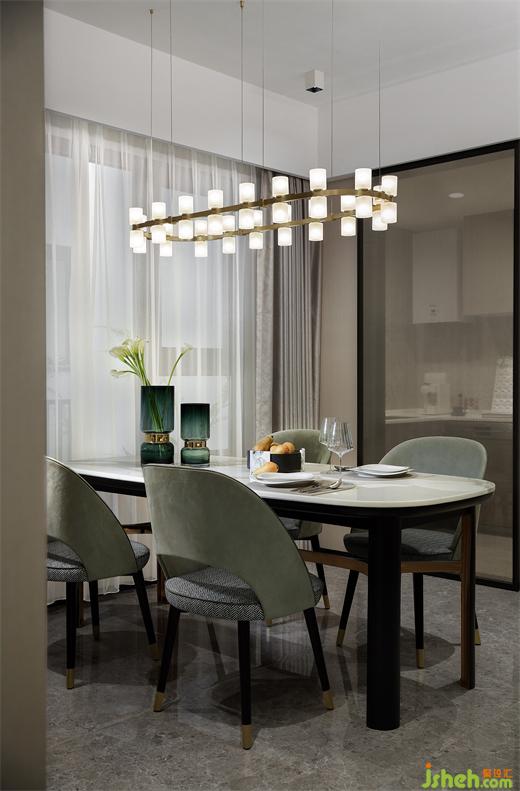 共聚一堂,共品一汤,也是一派温馨之景。餐厅从淡雅的绿着手,圆弧的造型中和硬朗,南京样板间设计配合协调的比例尺寸,释放场域。又以古铜灯具做点缀,在暖光的映照下,尽显轻盈之态。