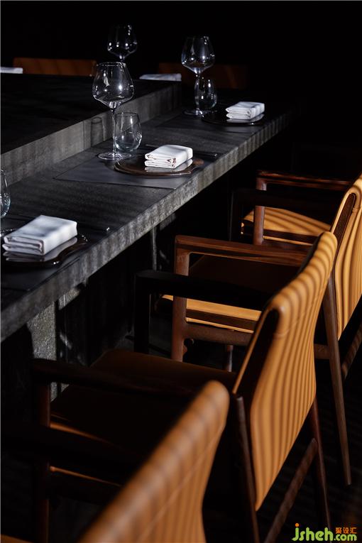 吧台则采用体块穿插来塑造,整合原始柱体,化零为整,于一体化的层叠并置中,透露细节巧思与表现张力。铁板烧餐厅设计格栅的设立与自然光线的点缀,打破单调与沉闷,亦带来了活力。